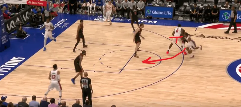 詹金斯和杜伦的掩护后后者快速顺下,珀尔特尔和沃尔特延误詹金斯,这时底线的奥萨向外撤出,slot区的哈里斯同时切入禁区帮助詹金斯和杜伦获得了连线机会,巴恩斯和英格拉姆都在无球端受到干扰,詹金斯得以抓住机会吊给篮下的杜伦: