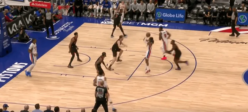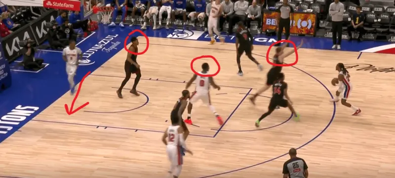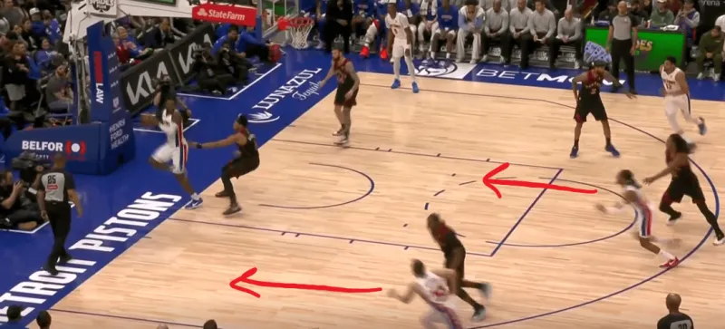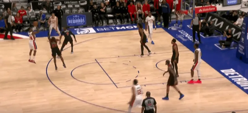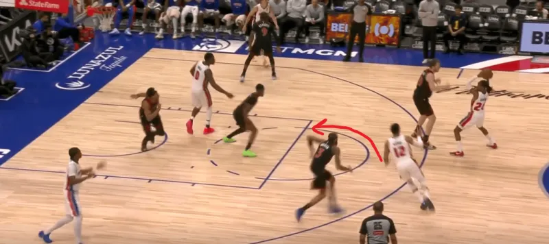 詹金斯和杜伦的掩护后后者快速顺下,珀尔特尔和沃尔特延误詹金斯,这时底线的奥萨向外撤出,slot区的哈里斯同时切入禁区帮助詹金斯和杜伦获得了连线机会,巴恩斯和英格拉姆都在无球端受到干扰,詹金斯得以抓住机会吊给篮下的杜伦: